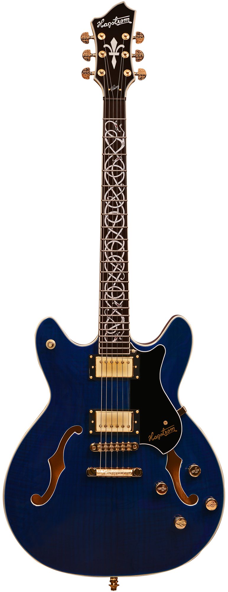 The semi-hollow body is crafted from hand-selected Canadian curly maple, delivering the characteristic warmth and resonance that define the Viking's character. The HAGSTROM Resinator™ fingerboard, known for its stability and balanced sound reproduction, features an exclusive Ragnarök snake fingerboard inlay, symbolizing tradition, transformation, and rebirth.