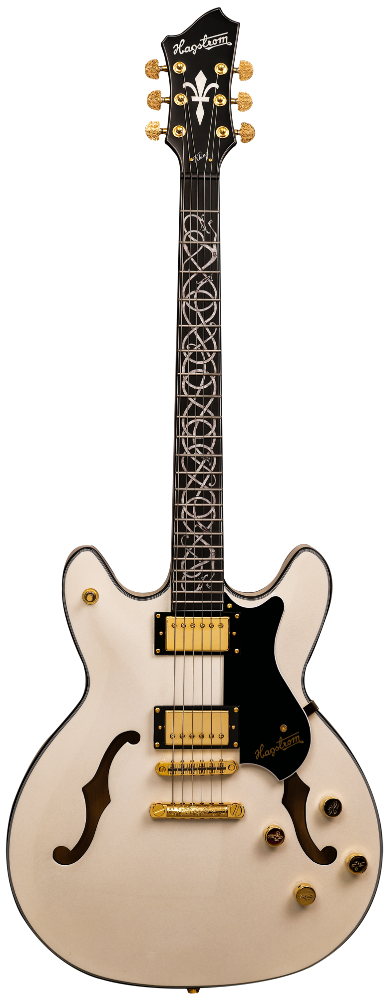 The semi-hollow body is crafted from hand-selected Canadian curly maple, delivering the characteristic warmth and resonance that define the Viking's character. The HAGSTROM Resinator™ fingerboard, known for its stability and balanced sound reproduction, features an exclusive Ragnarök snake fingerboard inlay, symbolizing tradition, transformation, and rebirth.